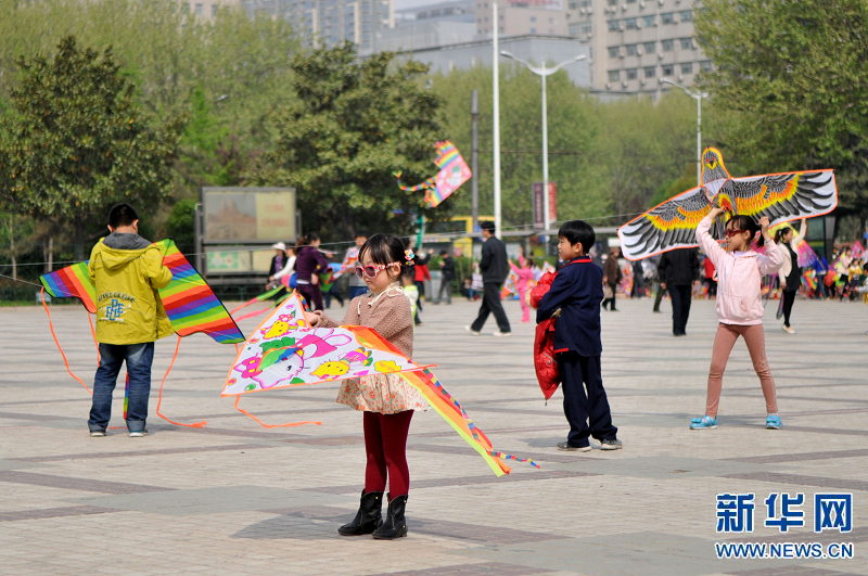 4月6日,小朋友們在鄭州市綠城廣場放風箏。