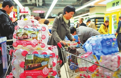 蘭州市一些市民從11日中午開始前往超市和商鋪搶購礦泉水、桶裝水等飲用水。蘭州市正組織保障好瓶裝水貨源的供應(yīng)。