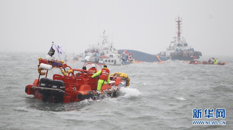 4月17日,救援人員在韓國全羅南道珍島港口附近海域的沉船地點搜救韓國“歲月”號客輪上的乘客。(新華社記者姚琪琳攝)