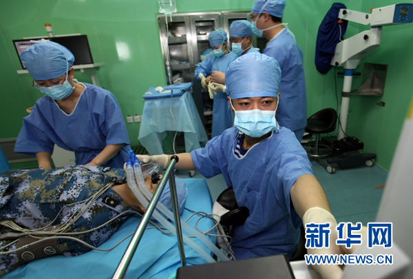 4月23日,和平方舟醫(yī)院船人員對“傷員”進行手術。 新華社發(fā) 黃育平 攝