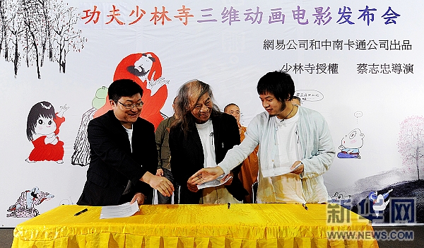 5月4日,臺灣漫畫家蔡志忠(中)與出品方代表浙江中南卡通有限公司總經(jīng)理沈玉良(左)、網(wǎng)易副總裁胡志鵬在《功夫少林寺》3D動畫電影發(fā)布會現(xiàn)場簽約。