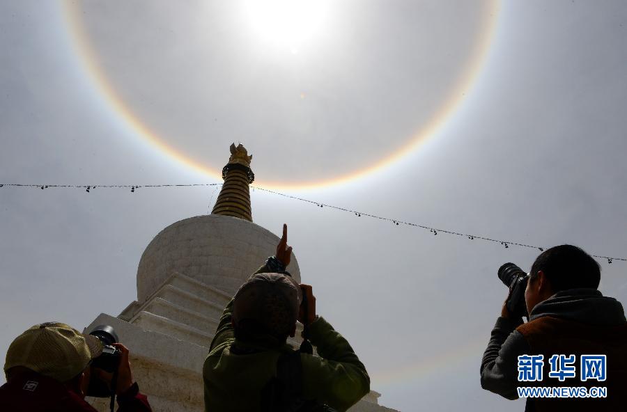 央廣網(wǎng)河南分網(wǎng)消息 據(jù)新華網(wǎng)報(bào)道:當(dāng)日,西藏拉薩上空出現(xiàn)日暈景觀。日暈是一種大氣光學(xué)現(xiàn)象,是日光通過(guò)卷層云時(shí),受到冰晶的折射或反射而形成的。當(dāng)光線(xiàn)射入卷層云中的冰晶后,經(jīng)過(guò)兩次折射,分散成不同方向的各色光。新華社記者 覺(jué)果 攝