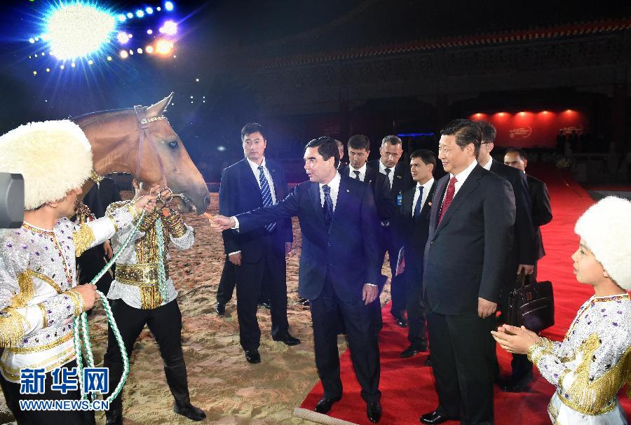 習(xí)近平接受了別爾德穆哈梅多夫代表土方贈(zèng)予中方的一匹汗血馬。掌聲、金鈴聲、歡呼聲響徹夜空。