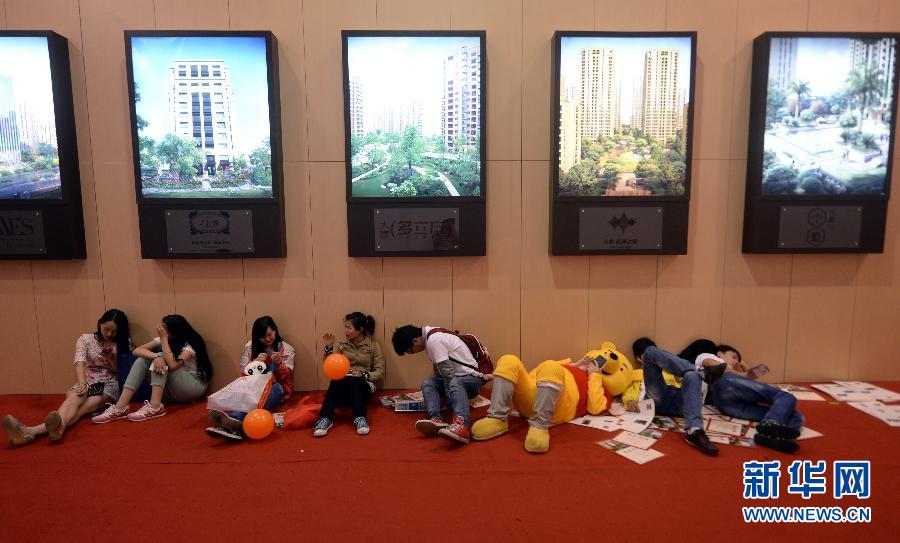 5月18日,杭州人居展上,推銷樓盤的工作人員在房交會現(xiàn)場的樓盤燈箱廣告下休息。