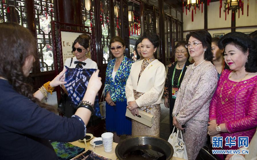 5月21日,國(guó)家主席習(xí)近平夫人彭麗媛邀請(qǐng)出席亞信上海峰會(huì)的部分國(guó)家領(lǐng)導(dǎo)人夫人共同觀看中國(guó)非物質(zhì)文化遺產(chǎn)展示和文藝演出。這是彭麗媛和來(lái)賓欣賞顧繡傳承人蘇惠萍用細(xì)若游絲的線(xiàn)一次成功穿過(guò)針眼。(新華社 記者黃敬文攝)