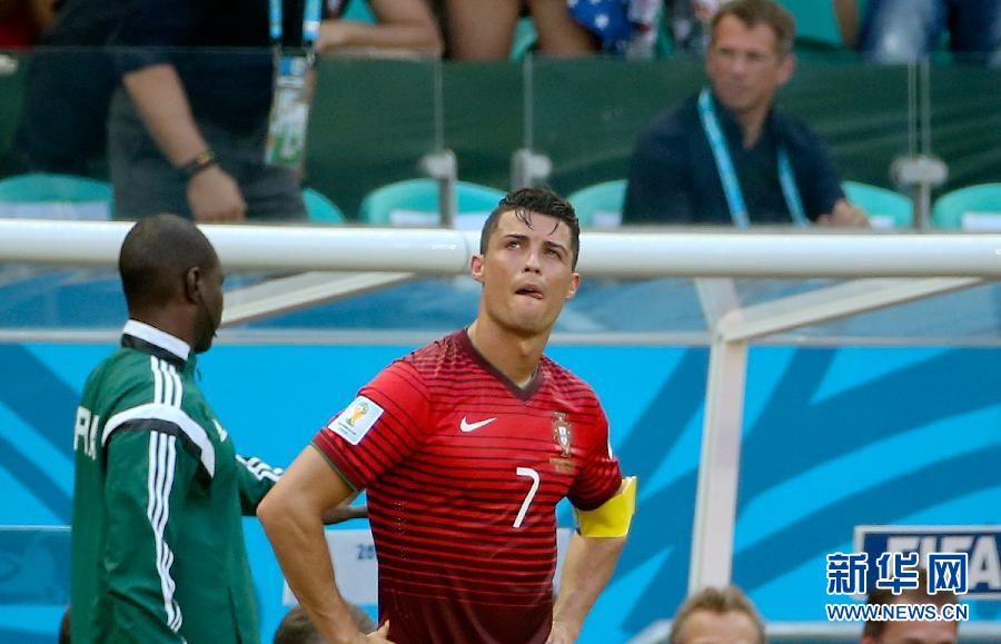 6月16日,葡萄牙隊(duì)球員克·羅納爾多在球隊(duì)丟球后表情沮喪。當(dāng)日,在巴西薩爾瓦多新水源競(jìng)技場(chǎng)進(jìn)行的2014年巴西世界杯小組賽G組比賽中,葡萄牙隊(duì)以0比4不敵德國(guó)隊(duì)。 新華社記者曹燦攝