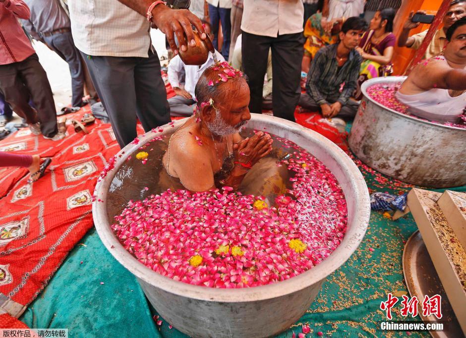 當(dāng)?shù)貢r(shí)間7月1日,印度阿拉哈巴德,印度教徒坐在盆子里舉行祈雨儀式。印度氣象部門稱該國(guó)今年6月1日至6月25日期間降雨比平均水平少了40%,并表示7月第一周將重新迎接降雨。