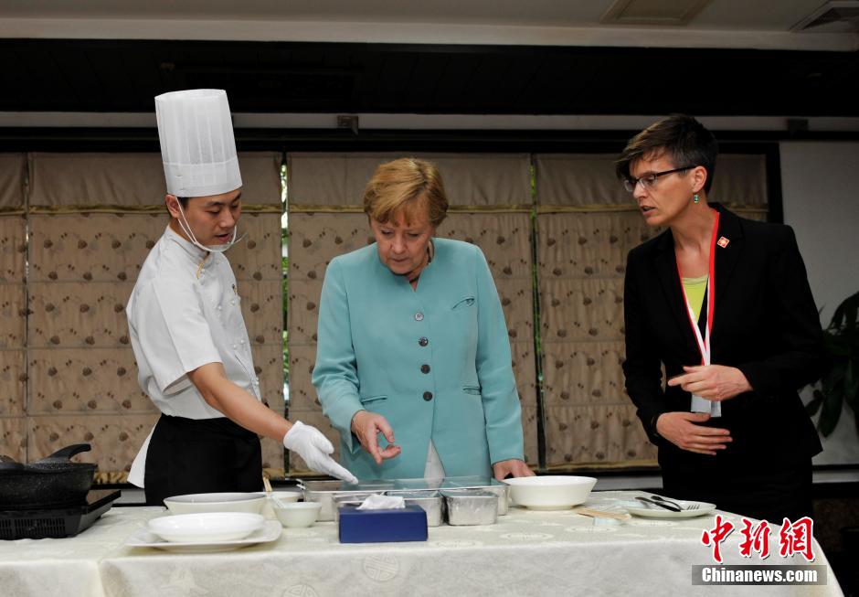 7月6日,應(yīng)中國國務(wù)院總理李克強邀請,德意志聯(lián)邦共和國總理安格拉·默克爾開始訪問中國。位于中國西部地區(qū)的四川省成都市是其訪華的第一站。圖為默克爾向川菜大廚學(xué)習(xí)宮保雞丁的做法。中新社發(fā) 安源 攝