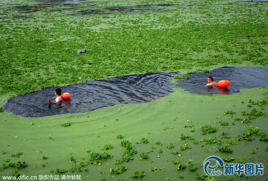 央廣網(wǎng)河南分網(wǎng)消息 據(jù)新華網(wǎng)報(bào)道:2014年7月10日下午。從漢江上游漂浮而下的浮萍等水生植物至今已持續(xù)存在近一個(gè)月之久,目前仍未有消退的跡象。在漢口江漢一橋附近,幾個(gè)碼頭周邊水域全被茂盛的水生植物包圍覆蓋。盡管如此,仍有不少愛(ài)水的市民在此納涼、戲水、釣魚(yú),成為獨(dú)特的都市風(fēng)景。