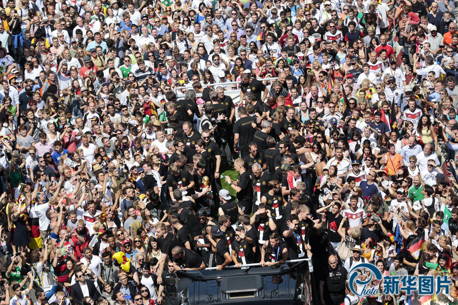 央廣網(wǎng)河南分網(wǎng)消息 據(jù)新華網(wǎng)報道:當(dāng)?shù)貢r間2014年7月15日,德國柏林,德國隊歸國舉行奪冠巡游。在當(dāng)天的奪冠慶;顒又,德國隊將士的敞篷大巴車將經(jīng)由柏林的鹿拉教堂街、河畔、萊因哈特街道、luisenstrasse街區(qū)、馬歇爾橋,最終抵達(dá)巴黎廣場。
