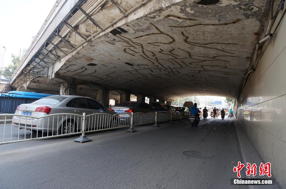 央廣網河南分網消息 據中新網報道:7月16日,記者現(xiàn)場看到,數百條“補丁”錯綜復雜貼于橋底頂部,讓人眼花繚亂。該橋連接火車站與二馬路汽車站,每天都有大量汽車、行人從上面通過?匆娺@些“補丁”,過往市民稱,既然有問題就得修,僅用補丁修復裂縫不靠譜,不知是否還存有安全隱患,從這走過著實讓人心慌。圖為鄭州二馬路跨正興街的馬路橋,橋底頂部布滿“補丁”。(周小云攝)