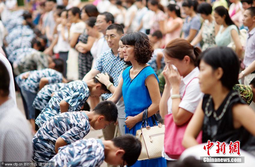2014年08月25日,江西省贛州市,在厚德外國(guó)語學(xué)校操場(chǎng)上,新生在給父母行禮感恩。
