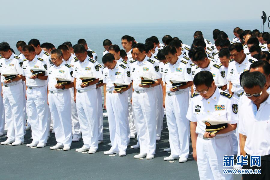央廣網河南分網消息 據新華網報道:8月27日,汽笛長鳴,參加祭奠儀式的軍地領導和官兵代表脫帽低頭默哀1分鐘。當日,海軍在威海劉公島海域舉行甲午戰(zhàn)爭120周年海上祭奠儀式。由導彈護衛(wèi)艦鹽城艦、臨沂艦、大同艦和1艘綜合保障船及2架艦載直升機組成的?站庩,分別向預定海域航渡。官兵在甲板分區(qū)列隊,在軍地領導和官兵代表嘹亮的國歌聲中,海上祭奠儀式開始。同一時刻,萬里海疆軍港內的艦艇齊聲鳴笛,祭奠在甲午戰(zhàn)爭中為國捐軀的北洋海軍將士。新華社記者查春明攝