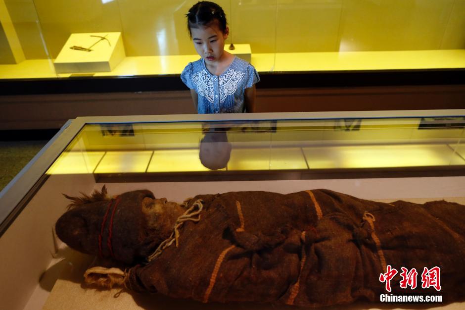 圖為一名女孩看到新疆維吾爾自治區(qū)博物館內的干尸后張大了嘴巴。 中新社發(fā) 張浩 攝