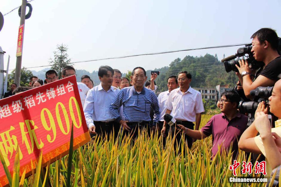 10月10日,農(nóng)業(yè)部組織專家,對由袁隆平院士領(lǐng)銜的第四期中國超級稻畝產(chǎn)1000公斤攻關(guān)項(xiàng)目進(jìn)行了測產(chǎn)驗(yàn)收。測產(chǎn)結(jié)果顯示,湖南溆浦縣橫板橋鄉(xiāng)紅星村超級稻攻關(guān)基地,百畝片平均畝產(chǎn)1026.70公斤。這標(biāo)志著中國超級雜交水稻第四期目標(biāo)畝產(chǎn)1000公斤攻關(guān)獲得成功,再創(chuàng)世界紀(jì)錄。 當(dāng)天,“雜交水稻之父”袁隆平抵達(dá)湖南溆浦縣橫板橋鄉(xiāng)紅星村超級稻攻關(guān)基地,視察由其領(lǐng)銜主攻的中國超級雜交稻第四期攻關(guān)品種“Y兩優(yōu)900”生長情況。圖為袁隆平視察超級雜交稻第四期攻關(guān)品種“Y兩優(yōu)900”生長情況。唐小晴 攝