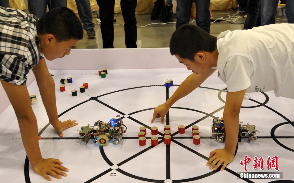 10月10日,機(jī)器人進(jìn)行光電創(chuàng)意比賽,讓機(jī)器人搬運(yùn)組合成數(shù)字圖案。當(dāng)日,2014年中國(guó)機(jī)器人大賽暨RoboCup(機(jī)器人世界杯)公開賽在安徽國(guó)際會(huì)展中心正式開幕,為期三天。來(lái)自南京大學(xué)、清華大學(xué)等國(guó)內(nèi)眾多高校的2000余名選手將在足球機(jī)器人、救援機(jī)器人、家庭機(jī)器人等多個(gè)項(xiàng)目上進(jìn)行比賽和展示。中新社發(fā) 韓蘇原 攝