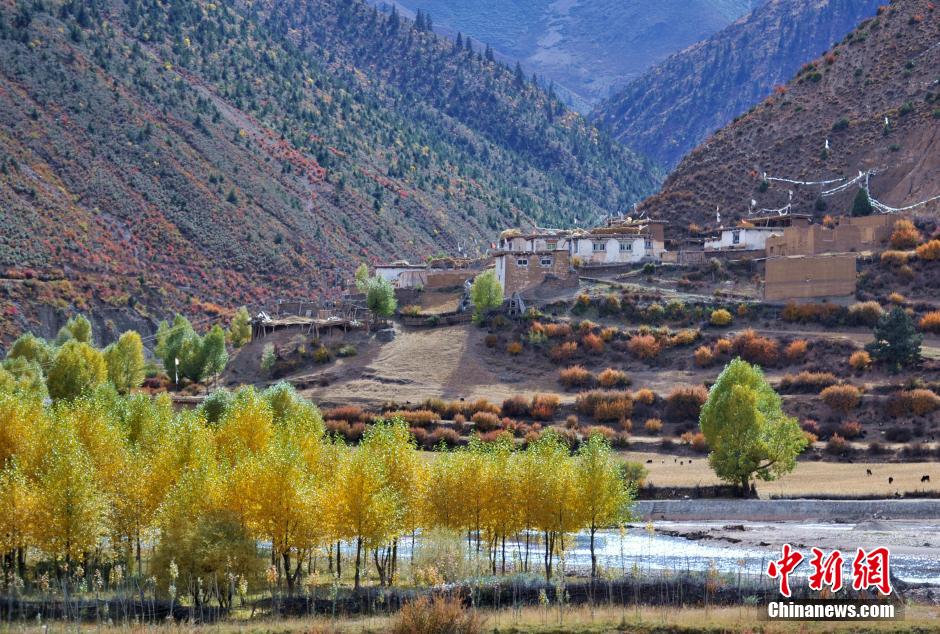 10月中旬以來(lái),國(guó)道318川藏線西藏昌都地區(qū)境內(nèi),迎來(lái)一年中最美的季節(jié),藏房、河流、雪山、金色的樹林構(gòu)成一幅幅美麗的畫卷,讓人流連忘返。圖為西藏昌都國(guó)道318川藏線路邊的秋色。中新社發(fā) 劉忠俊 攝
