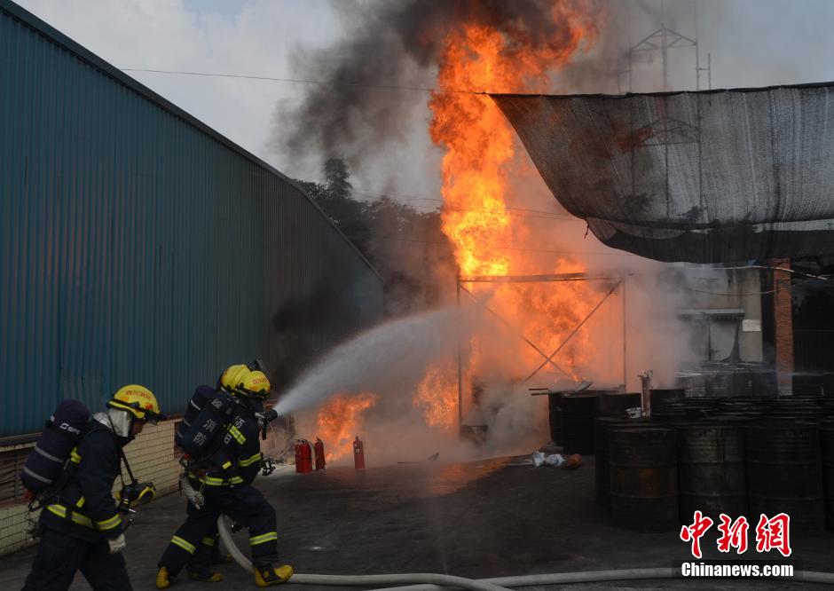 10月20日,四川綿陽市一飼料廠發(fā)生火災(zāi),位于露天油脂灶上的6個裝滿豬油的油桶猛烈燃燒,火焰達到5米多高,起火點左側(cè)是一棟放著大量糧食的倉庫,右側(cè)還存放著十余桶豬油,隨時都有引起大面積燃燒的可能。綿陽市119指揮中心接到報警后,立即調(diào)派特勤中隊趕赴現(xiàn)場處置。經(jīng)過消防官兵的奮力撲救,大火被成功撲滅。 中新社發(fā) 田猛 攝