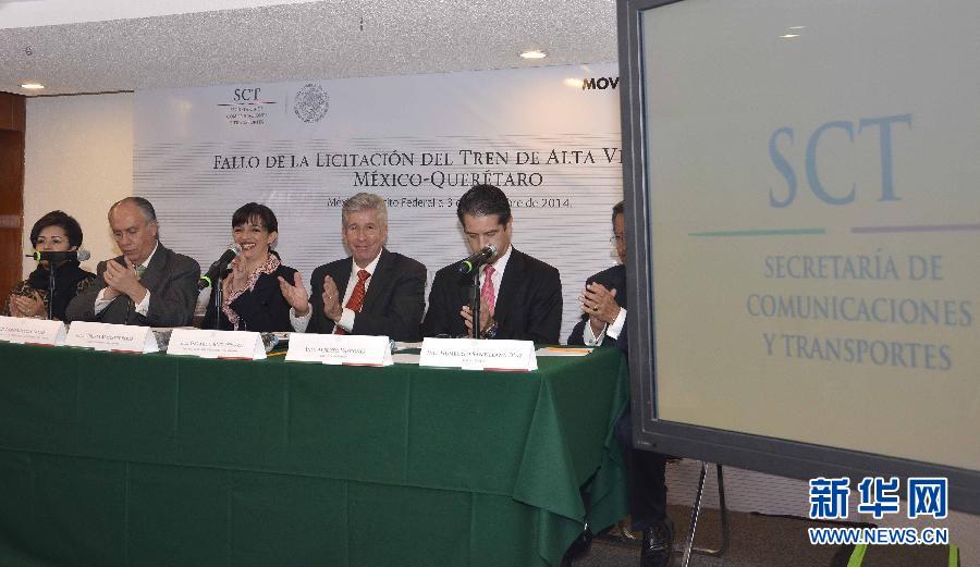 央廣網(wǎng)河南分網(wǎng)消息 據(jù)新華網(wǎng)報(bào)道:11月3日,墨西哥通信和交通部長魯伊斯·埃斯帕薩(左四)等人在首都墨西哥城出席新聞發(fā)布會(huì)。北京時(shí)間11月4日凌晨,墨西哥通信和交通部宣布,由中國鐵建牽頭的國際聯(lián)合體中標(biāo)墨西哥國內(nèi)首條高鐵——墨西哥城至克雷塔羅高速鐵路項(xiàng)目。這是中國在海外設(shè)計(jì)、承建并完全采用中國標(biāo)準(zhǔn)和裝備的首條時(shí)速300公里高鐵,是中國高鐵“走出去”真正意義上的“第一單”。新華社發(fā)(墨西哥通信和交通部提供)