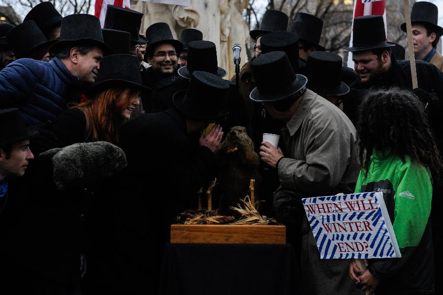 央廣網(wǎng)河南分網(wǎng)消息 2月2日,在美國首都華盛頓,人們圍繞在該地區(qū)的土撥鼠波托馬克·菲爾旁,“聆聽”它的預(yù)測。波托馬克·菲爾是一個土撥鼠模型。每年的2月2日是北美地區(qū)的傳統(tǒng)節(jié)日“土拔鼠日”。根據(jù)傳說,如果土撥鼠從洞穴里爬出后能看到自己的影子,當(dāng)?shù)厝司蜁嘈哦熘辽龠有六周才會結(jié)束。根據(jù)土撥鼠日官方網(wǎng)站發(fā)布的消息,美國最著名的“天氣預(yù)測專家”、來自賓夕法尼亞州的土撥鼠“菲爾”2日晨出洞后看到了自己的影子,預(yù)測美國至少還要忍受六周的寒冷冬日。新華社記者鮑丹丹攝