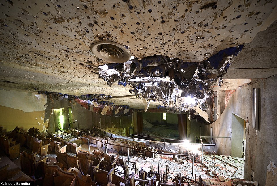 昔日的光輝:這里曾是熙熙攘攘的會(huì)堂,但是現(xiàn)在天花板已經(jīng)破爛不堪,地板上也盡是碎石、垃圾。(網(wǎng)站截圖)