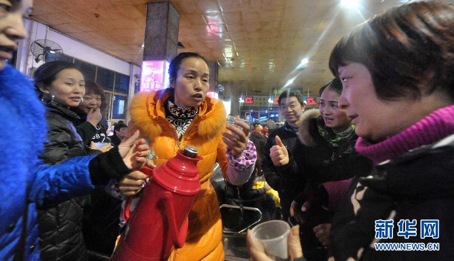 央廣網(wǎng)河南分網(wǎng)消息 2月3日,韓無鹽在告訴乘客姜湯怎么喝最舒服。湖南省株洲市環(huán)保局蘆淞分局的女職工韓無鹽,連續(xù)七年多時(shí)間在株洲火車站免費(fèi)給旅客送姜湯,將溫暖傳遞給旅客,被親切地稱為“姜湯大姐”。 “感冒、暈車、咳嗽、身體寒冷的旅客注意啦,這里有免費(fèi)的姜湯!2月3日夜里,記者在株洲火車站候車室看到,“姜湯大姐”韓無鹽右手提熱水瓶,左手提一串一次性杯子,時(shí)不時(shí)給需要的旅客倒上一杯姜湯。韓無鹽學(xué)過中醫(yī),從2008年初開始,就用姜絲、紅糖、鹽熬成姜湯,無論春夏秋冬,只要沒加班、沒出差,幾乎每天下班后,她都會(huì)到火車站送姜湯。據(jù)她介紹,2010年以前,平均每天送出300杯姜湯,近幾年株洲西站和湘潭火車站的開通分流了許多旅客,但每天還是要送近150杯姜湯。粗略計(jì)算,7年下來,韓無鹽送的姜湯總量不下50萬杯,溫暖了來往的旅客。談起這些年的堅(jiān)持,韓無鹽笑著說:“把快樂帶給別人,自己更快樂! 新華社記者 龍弘濤 攝