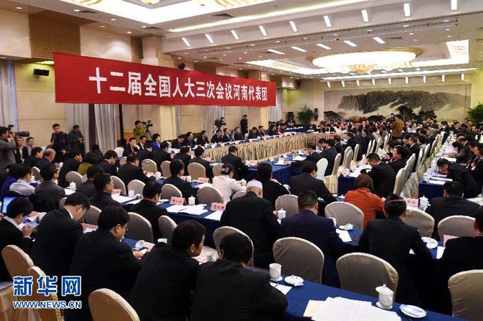 新華網(wǎng)河南頻道3月6日電 3月5日,十二屆全國人大三次會(huì)議河南代表團(tuán)舉行全體會(huì)議。 新華社記者李博 攝