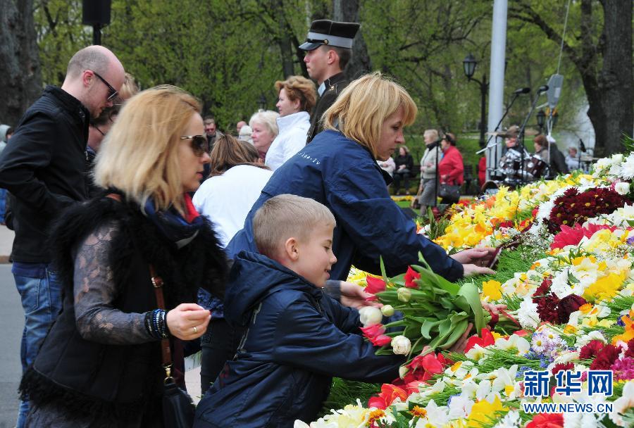 5月4日,在拉脫維亞首都里加,兒童在家長的帶領(lǐng)下向獨(dú)立紀(jì)念碑獻(xiàn)花。