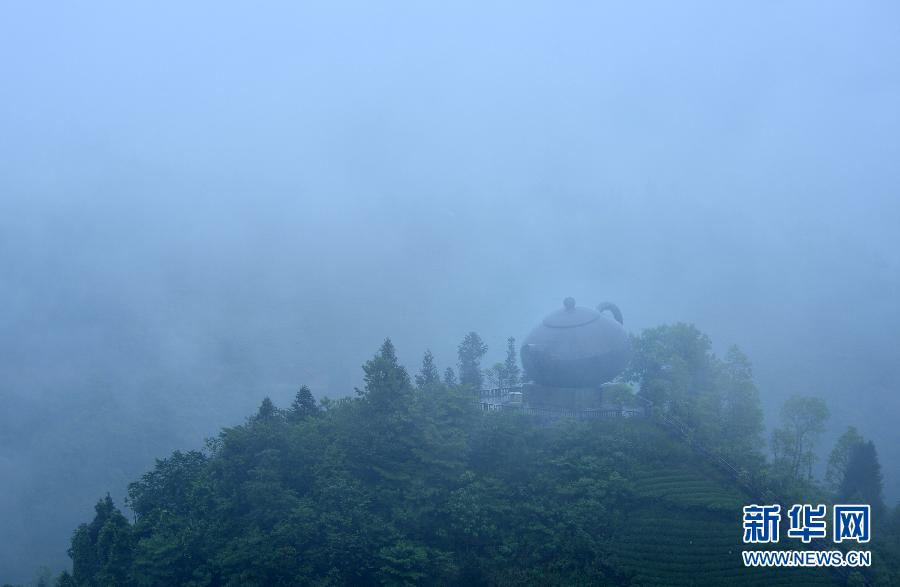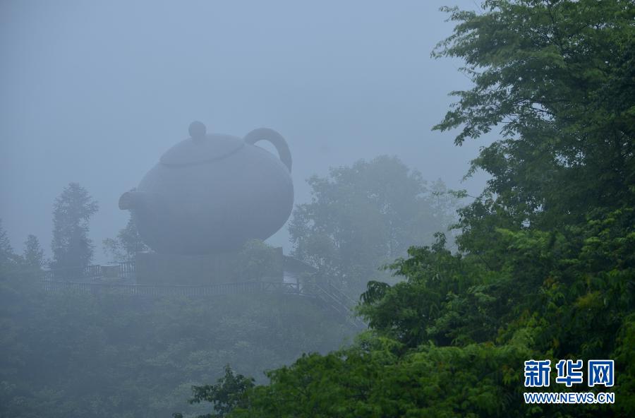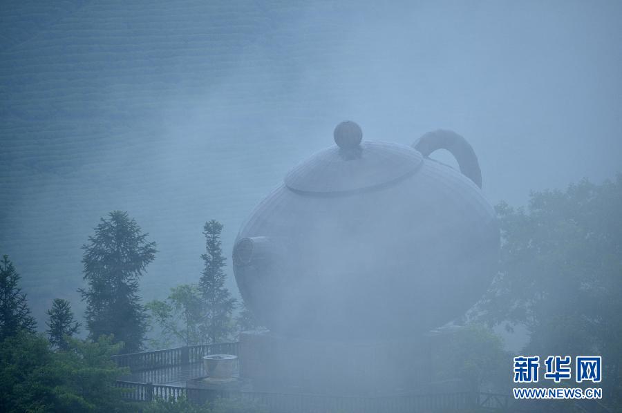 這是5月5日在湖北省宣恩縣伍家臺(tái)村拍攝的巨型茶壺。春夏之交,湖北名茶“伍家臺(tái)貢茶”發(fā)源地——恩施土家族苗族自治州宣恩縣伍家臺(tái)村時(shí)常云霧繚繞,茶山上一把直徑16.5米、高10米的巨型茶壺因此“熱氣騰騰”,為茶園增添了別樣的風(fēng)情。新華社發(fā)(宋文 攝)