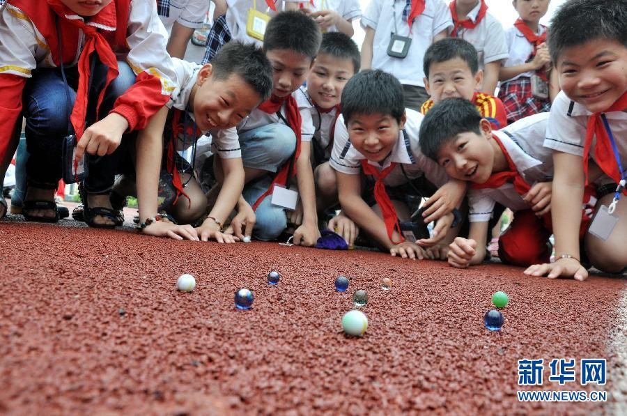江西省萬(wàn)載縣第一小學(xué)學(xué)生在玩“打彈珠”(5月27日攝)。