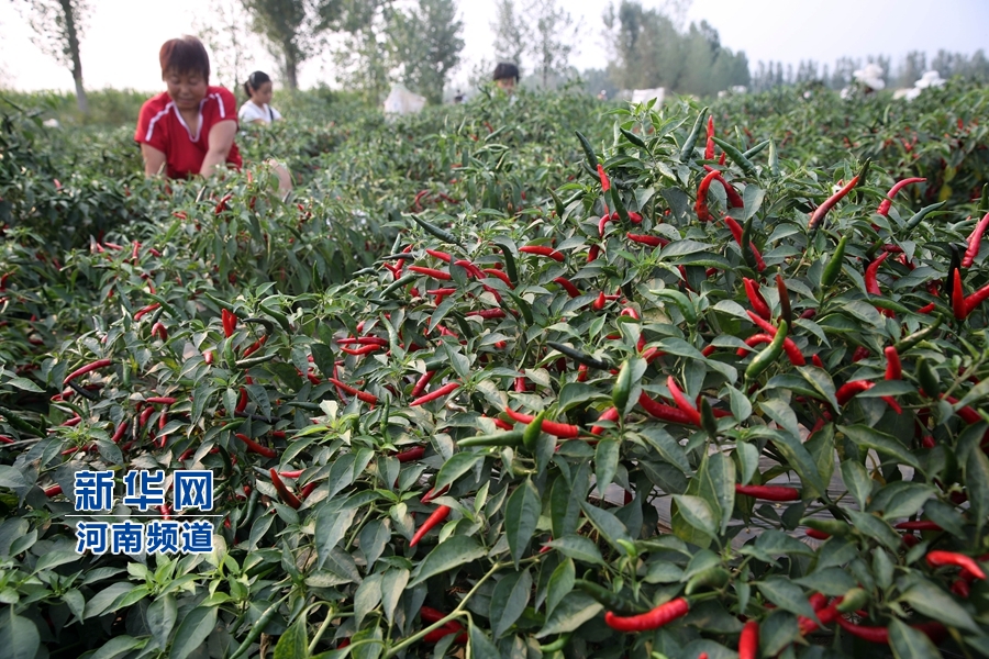 8月27日,平頂山市寶豐縣辣椒種植合作社社員正在收獲“訂單辣椒”。