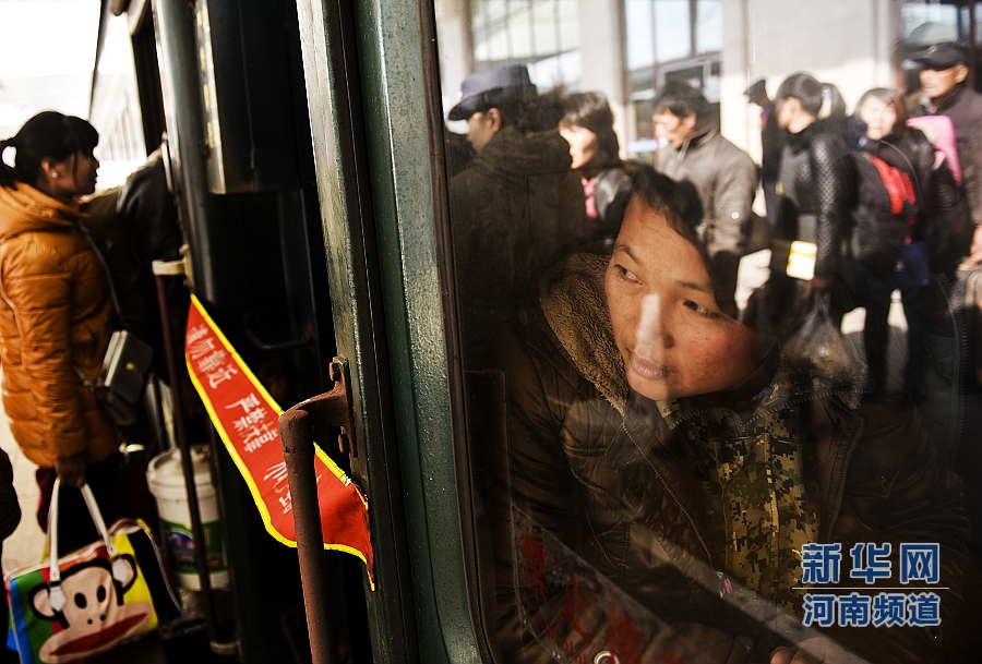 11月5日,一名拾花工在車廂里看著同鄉(xiāng)登車。