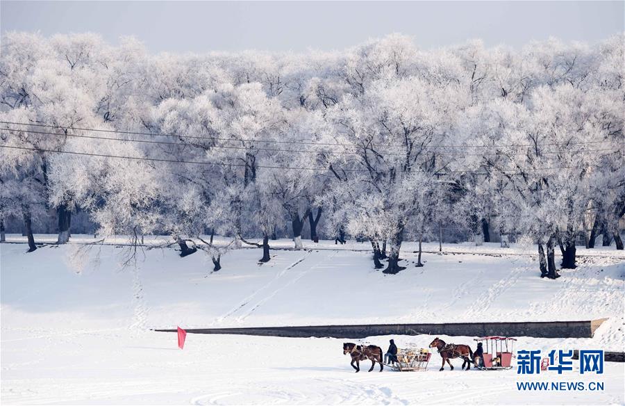 12月25日,在太陽(yáng)島風(fēng)景區(qū),兩輛馬拉雪橇從一處?kù)F凇景觀經(jīng)過(guò)。當(dāng)日,享譽(yù)國(guó)內(nèi)外的冰城哈爾濱市5A級(jí)景區(qū)太陽(yáng)島風(fēng)景區(qū)迎來(lái)霧凇景觀。太陽(yáng)島上的草木被霧凇裝點(diǎn),晶瑩剔透、美不勝收。 新華社記者 王建威攝