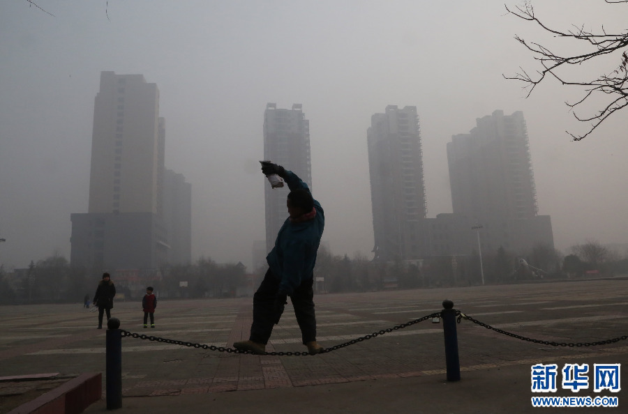 1月10日,濃霧之中,市民在河南寶豐新世紀廣場做作鋼鏈懸空平衡健身運動。