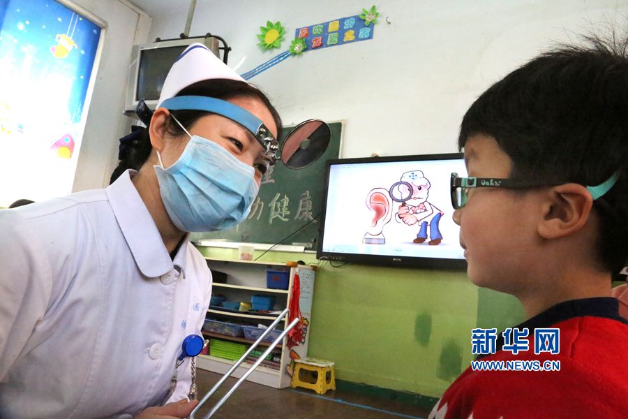 2016年3月2日,河南省安陽市婦女兒童活動(dòng)中心幼兒園,來自安陽地區(qū)醫(yī)院耳鼻喉科的醫(yī)生曹艷利正在和大三班的任博森小朋友親切交流并用音叉(聽力檢測(cè)儀)為其做聽力檢查。