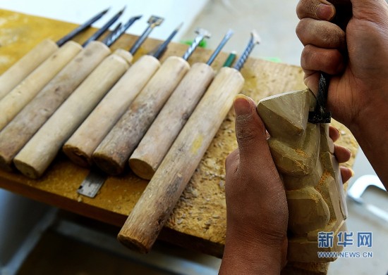 6月16日,王國慶在工作室內(nèi)雕刻石猴。