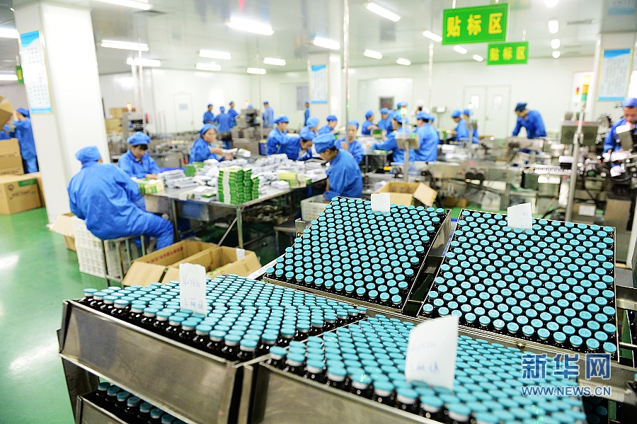 7月29日,在河南省淅川縣某藥業(yè)公司生產(chǎn)車間,工人在生產(chǎn)以金銀花為原料的雙黃連口服液。