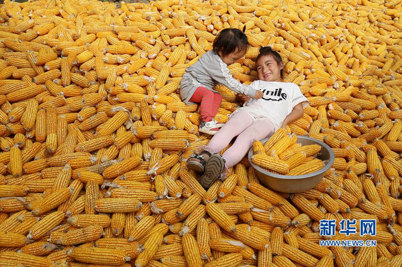 10月5日,河南省溫縣黃莊鎮(zhèn)衛(wèi)村兩名小朋友在晾曬的玉米堆上玩耍。
