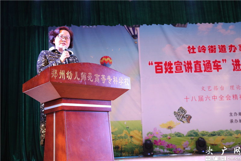 央廣網(wǎng)河南分網(wǎng)12月18日消息 12月15日、16日下午,正在金水區(qū)巡回宣講十八屆六中全會精神的鄭州市十八屆六中全會精神宣講團(tuán)成員、鄭州市工程技術(shù)學(xué)院呂村教授,在鄭州幼兒師范高等?茖W(xué)校禮堂內(nèi),又登上了一個(gè)特殊的講臺,杜嶺街道辦事處“百姓宣講直通車”進(jìn)基層巡演活動的舞臺,繼續(xù)為近1500名觀眾宣講十八屆六中全會精神。