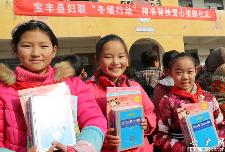 央廣網(wǎng)河南分網(wǎng)消息 12月16日,河南省寶豐縣東部山區(qū)的李莊鄉(xiāng)程莊村小學(xué)全體同學(xué)們展示自己免費獲贈的《西游記》、《水滸傳》、《紅樓夢》、《三國演義》和漢語成語小詞典 。?河南省寶豐縣婦聯(lián)冬日開展的“冬暖行動”公益事業(yè), 收到社會各界捐獻的衣物、書籍等物品近萬件, 近600名貧困學(xué)生和眾多貧困山區(qū)群眾受到救助。 社會各界為貧困、留守兒童送溫暖、獻愛心,為兒童健康成長營造 良好的社會環(huán)境。(通訊員:王雙正)