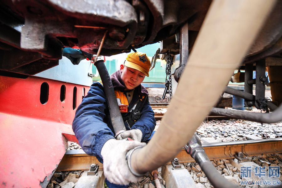 1月24日,一名連接員在連接車廂的底管。 春節(jié)臨近,鐵路迎來節(jié)前客流高峰。鐵路運(yùn)輸工作中,離不開一群為火車“穿針引線”的人——調(diào)車員,他們24小時(shí)不間斷輪班,保證列車按時(shí)出入庫,并根據(jù)車次、客流的變化,對列車車廂進(jìn)行拆分和重新編組,保障春運(yùn)期間列車安全、準(zhǔn)時(shí)運(yùn)送旅客。 鄭州火車站運(yùn)轉(zhuǎn)車間調(diào)車長程浩說:“我們的工作是把一節(jié)節(jié)車廂編組成一列火車,將其中有問題的車廂換掉,送檢、清洗,再將整列火車?yán)交疖囌景l(fā)車,形象點(diǎn)說就是為火車穿針引線。”在鄭州火車站運(yùn)轉(zhuǎn)車間,調(diào)車小組一般由5人組成:一名調(diào)車長,四名組員。組長負(fù)責(zé)指揮調(diào)車任務(wù),組員負(fù)責(zé)檢查和監(jiān)督列車車廂之間的分解與連掛,為車輛進(jìn)行排風(fēng)、摘管等。 春運(yùn)期間,鄭州火車站運(yùn)轉(zhuǎn)車間平均每天要對70余列近1300輛車進(jìn)行調(diào)車作業(yè),比平時(shí)增加30%左右的工作量。 新華社記者 李博 攝 -