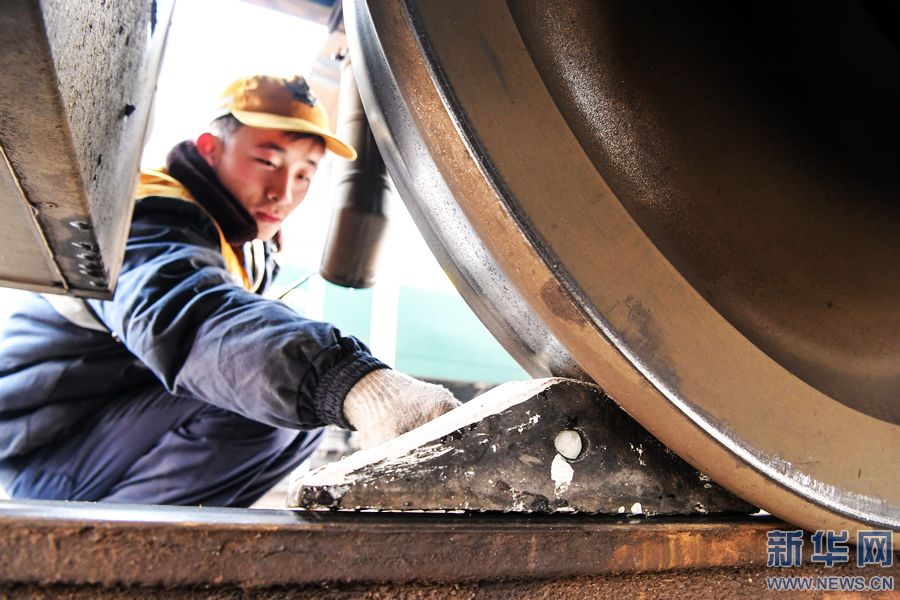 1月24日,一名調(diào)車員將止輪器放在車輪下,進(jìn)行防溜作業(yè)。 春節(jié)臨近,鐵路迎來節(jié)前客流高峰。鐵路運(yùn)輸工作中,離不開一群為火車“穿針引線”的人——調(diào)車員,他們24小時(shí)不間斷輪班,保證列車按時(shí)出入庫,并根據(jù)車次、客流的變化,對列車車廂進(jìn)行拆分和重新編組,保障春運(yùn)期間列車安全、準(zhǔn)時(shí)運(yùn)送旅客。 鄭州火車站運(yùn)轉(zhuǎn)車間調(diào)車長程浩說:“我們的工作是把一節(jié)節(jié)車廂編組成一列火車,將其中有問題的車廂換掉,送檢、清洗,再將整列火車?yán)交疖囌景l(fā)車,形象點(diǎn)說就是為火車穿針引線!痹卩嵵莼疖囌具\(yùn)轉(zhuǎn)車間,調(diào)車小組一般由5人組成:一名調(diào)車長,四名組員。組長負(fù)責(zé)指揮調(diào)車任務(wù),組員負(fù)責(zé)檢查和監(jiān)督列車車廂之間的分解與連掛,為車輛進(jìn)行排風(fēng)、摘管等。 春運(yùn)期間,鄭州火車站運(yùn)轉(zhuǎn)車間平均每天要對70余列近1300輛車進(jìn)行調(diào)車作業(yè),比平時(shí)增加30%左右的工作量。 新華社記者 李博 攝 -