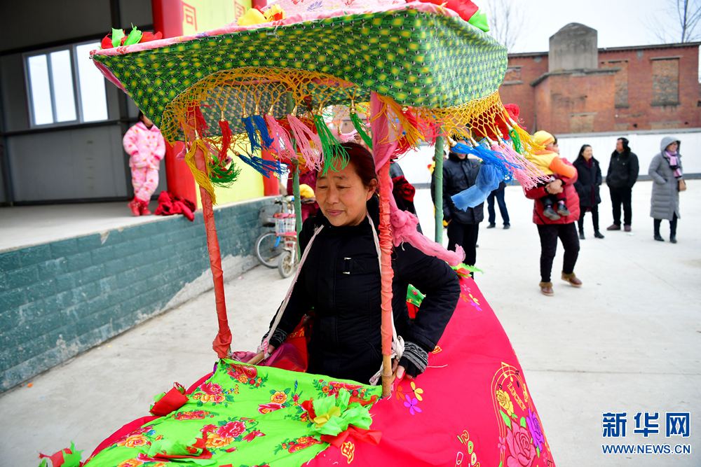 2月7日,村民在羅閣村文化舞臺表演劃旱船。 當日,河南省駐馬店市西平縣盆堯鎮(zhèn)羅閣村的文化舞臺熱鬧非凡,村民表演了舞獅、豬八戒背媳婦、抬轎子、劃旱船、騎竹馬、吹喇叭等民俗節(jié)目,吸引眾多村民前來觀看。新華社記者馮大鵬攝 -