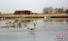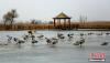 2月16日,地處甘肅河西走廊,祁連山下的張掖市,在春風(fēng)的吹拂下,氣候開始溫暖起來。在張掖國家濕地公園里,湖水冰面開始消融,一群斑頭雁在此嬉戲、覓食。它們有站的,有臥的,還有小心翼翼在冰面上行走的,萌態(tài)十足。 陳禮 攝 -