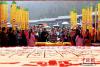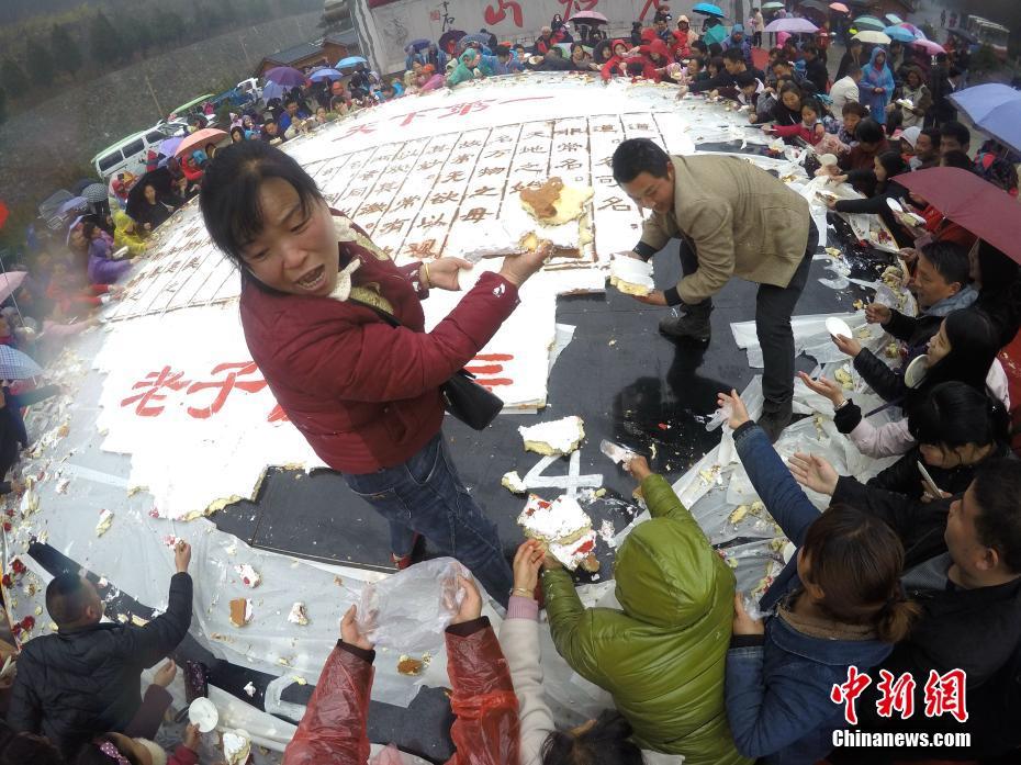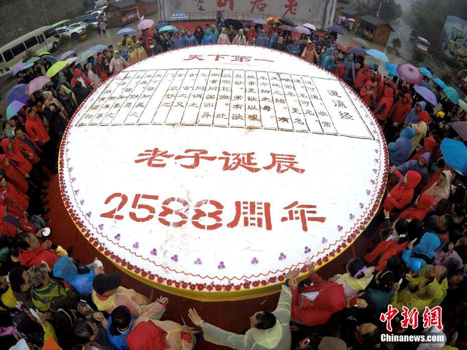 2017年3月12日(農(nóng)歷二月十五)是老子李耳誕辰2588年紀(jì)念,道教圣地河南洛陽(yáng)老君山,世界第一高的老子銅像下,一個(gè)超級(jí)大蛋糕趕制完成,老子的千古巨著《道德經(jīng)》也被“寫”到了大蛋糕上,大批民眾圍觀,場(chǎng)面宏大。據(jù)了解,為趕制這個(gè)《道德經(jīng)》大蛋糕,主辦方用了雞蛋30000枚、白糖900斤、純牛奶600斤、奶油1200斤等物料,蛋糕總重達(dá)5噸。相傳河南欒川老君山是道教始祖李耳的歸隱地,每年都有大批的信眾前去紀(jì)念老子誕辰。經(jīng)老君山道長(zhǎng)的加持祈福后,這個(gè)超級(jí)《道德經(jīng)》大蛋糕被近萬(wàn)民眾陸續(xù)分食一空。 中新社記者 王中舉 攝 -