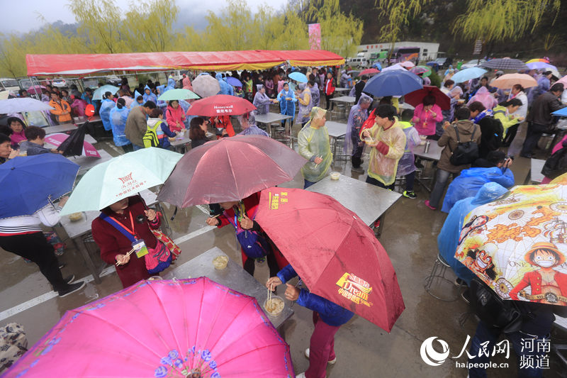 4月9日,河南欒川陶灣鎮(zhèn)一景區(qū)免費向游客發(fā)放餃子,雖然天下著大雨,但是陸續(xù)吸引千余名游客自覺排隊等候品嘗免費的午餐!帮溩友纭眻雒鎵延^,據(jù)了解當(dāng)天景區(qū)免費送出的餃子達(dá)一噸有余。(霍亞平)