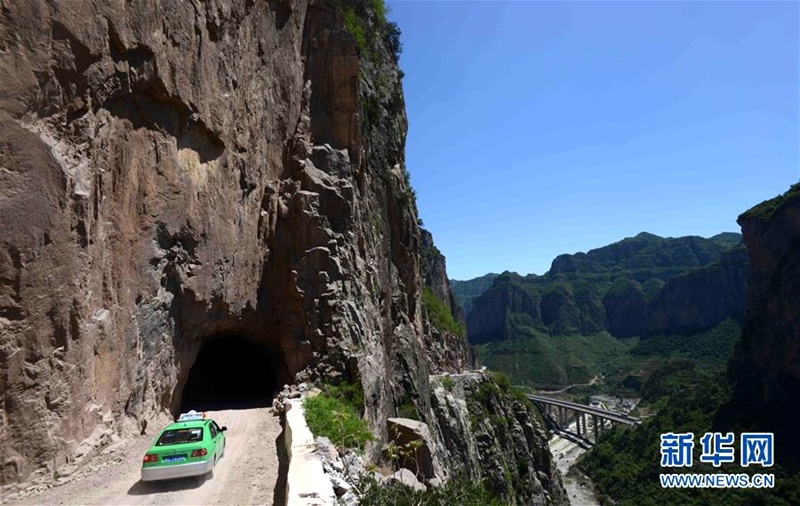 5月16日,一輛汽車在山西省平順縣的虹梯關(guān)“掛壁公路”行駛。山西省平順縣的虹梯關(guān)“掛壁公路”位于太行山峭壁之上,長度約10公里,鑿山穿洞,道路艱險,風(fēng)光獨特。 新華社發(fā)(梁棟 攝)