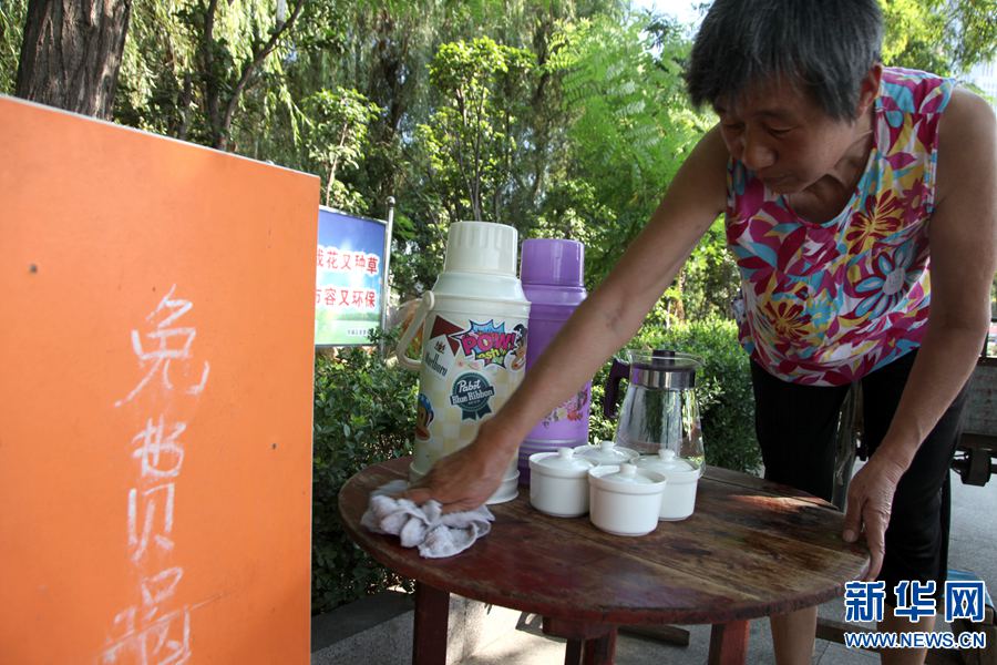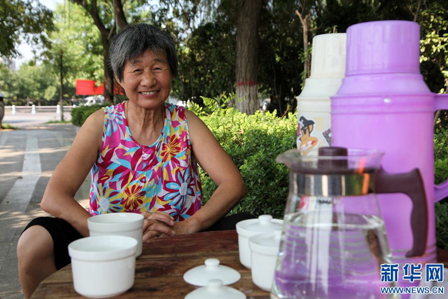 開“免費茶攤”的老人名叫段守蘭,家住許昌市東城區(qū)半截河街道辦事處徐灣社區(qū)。據(jù)段守蘭介紹說,她從7月初開始,每天早上8時許,她都會把茶水點安頓好。她分別會在午飯過后、下午16時用新燒開的水將容器加滿,直到晚上20時她才“收攤兒”。段守蘭的家人都非常支持她。 -