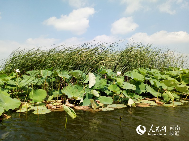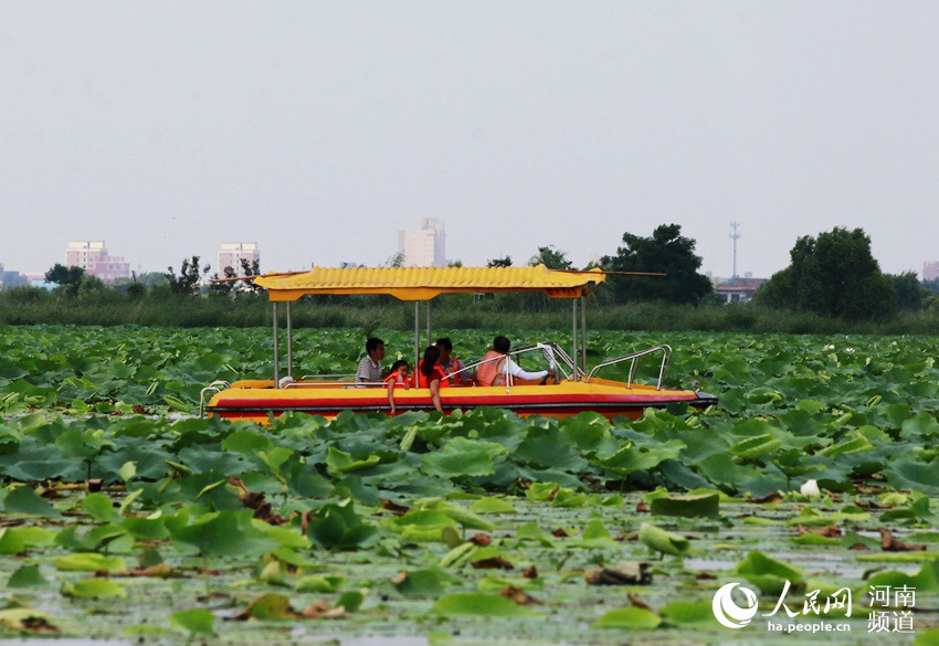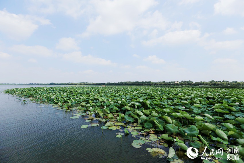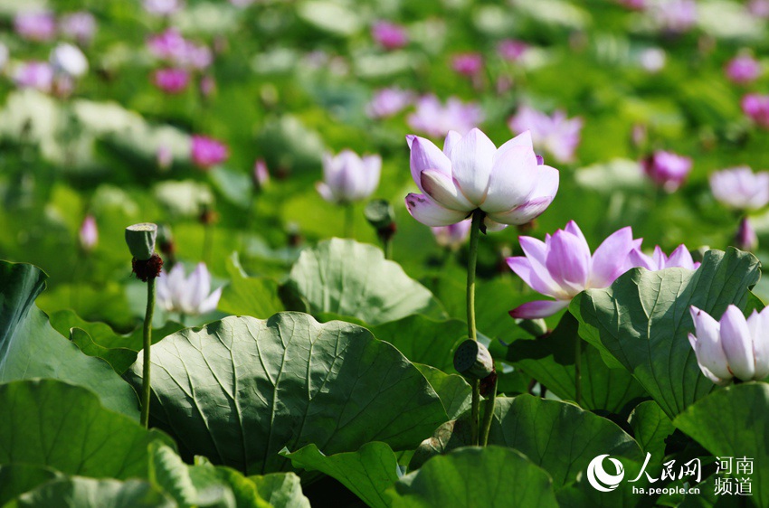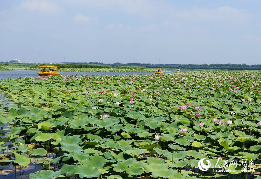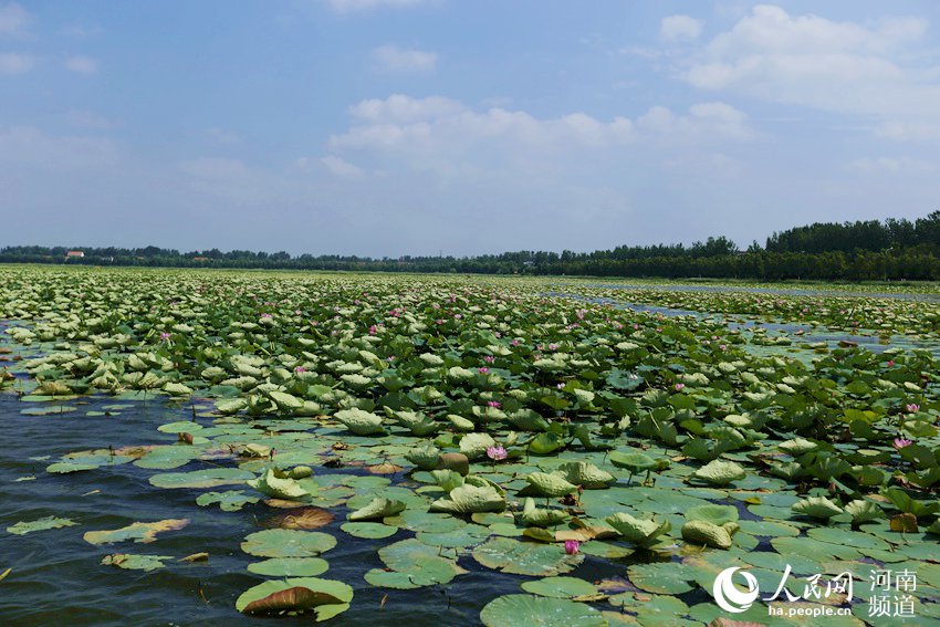 接天蓮葉無窮碧、映日荷花別樣紅。每年夏秋時(shí)節(jié),河南淮陽(yáng)萬畝龍湖荷花競(jìng)放,清香四溢,成為游人觀荷消暑的好去處! -
