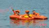 16名中國航天員和2名歐洲航天員,8月21日在山東省煙臺市附近海域圓滿完成了為期17天的海上救生訓練任務。圖為訓練期間,8月8日,參加訓練的航天員在水上使用光煙信號管。 中新社發(fā) 朱九通 攝 -